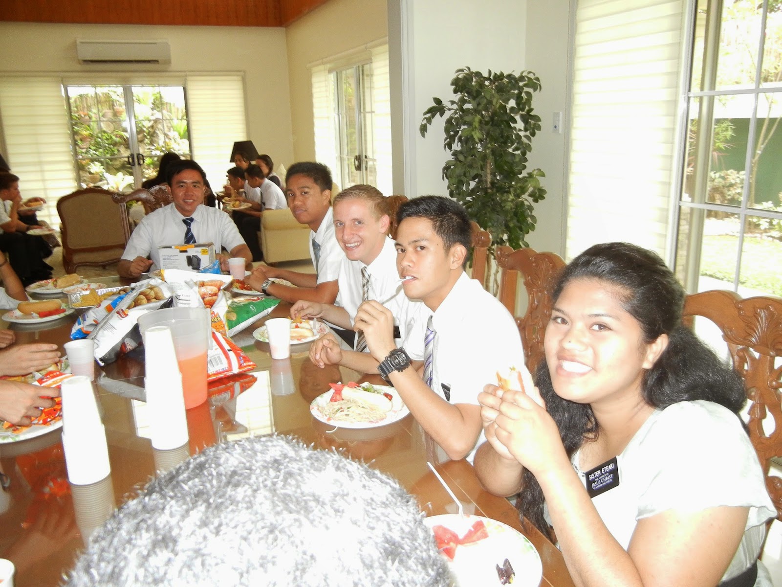 The Las Piñas and Bacoor zones were treated to a hot dog lunch and movie on P-day this week. They earned this opportunity because the missionaries in these zones averaged 6 or more investigators at a Sacrament Meeting. Whoot! Whoot! Along with their barbecued hot dogs they had watermelon, spaghetti salad, chips, (they cleaned us out of chips!), ice cream, cookies, and President Tye's famous brownies. The best part of our day was watching Meet The Mormon's. We set up the movie screen and all 45 of us sat and watched the show. It was fun listening to all of them laugh - I love the missionaries!
